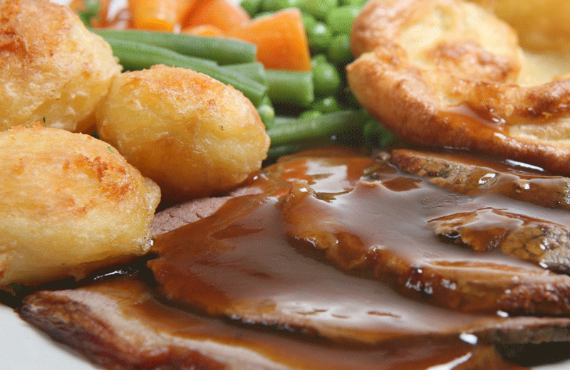 Roast beef served with roast potatoes, seasonal vegetables, Yorkshire pudding, horseradish sauce and gravy (allergens: sulphites, egg, milk, mustard, gluten): £16.99